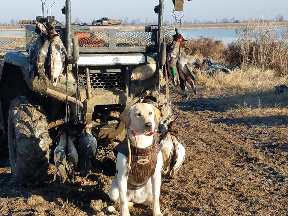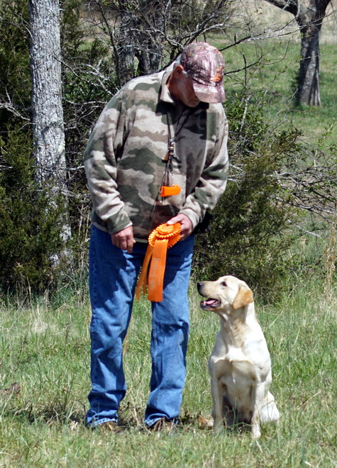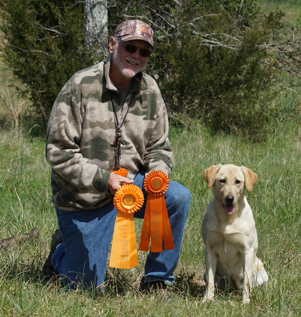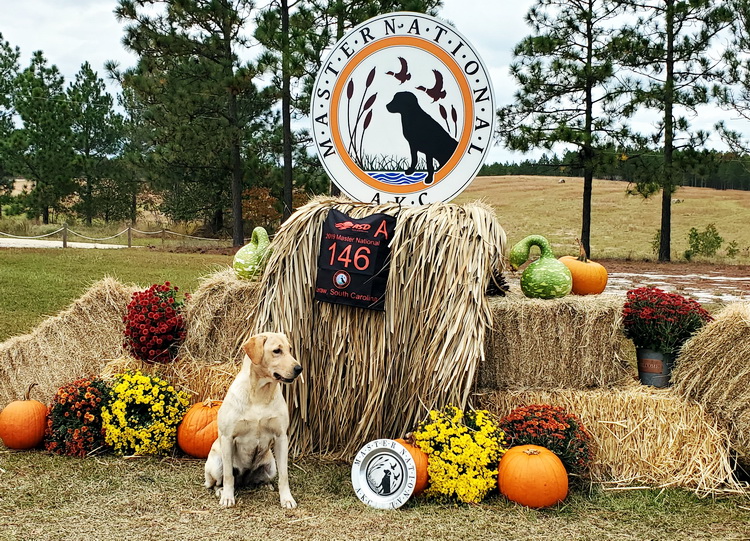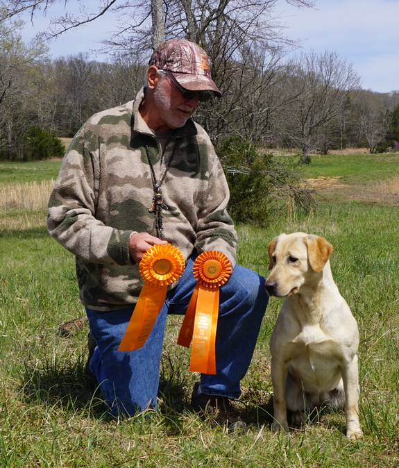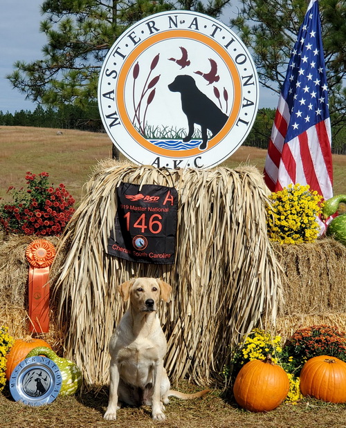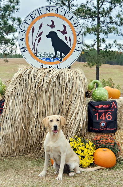 Dyna is very biddable, easy to train, quiet and well mannered in the house. She has passed 10 of 11 Master tests, and has 2 Jams in Qualifying. Dyna has never ran Junior or Senior tests. She has 2 seasons real world Duck hunting under her belt, quiet and steady in the blind, a true predator retrieving birds. Dyna is a 60 lb yellow with a correct "Labrador coat". After this litter Dyna will continue testing, trialing and hunting. She qualified for the '19 Master National along with her mother, Hoochie. Both brought home the big ribbons and plates with their 1st trip and first pass at the Master National. Dyna is 100% Breeder/Owner Trained and Handled. She is the third generation of MH females from our breeding. Dyna is the 5th generation of Stoneridge girls.