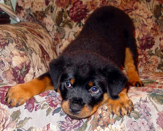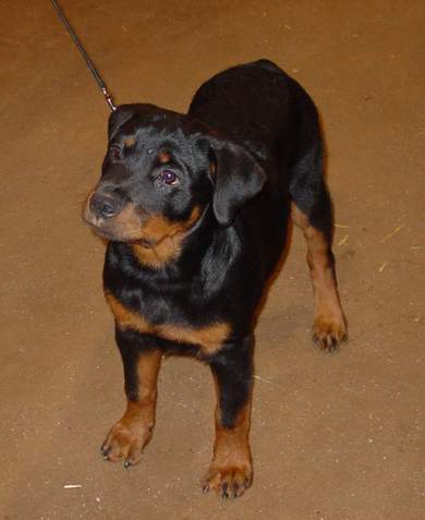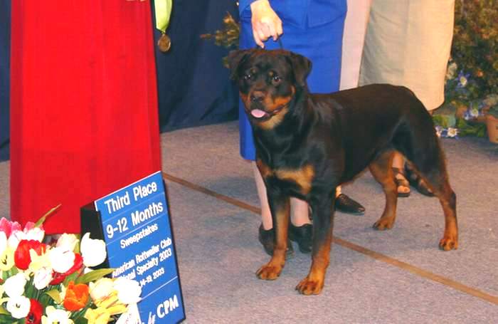 Litter 1: 2 of her puppies took Best in Sweeps, 2 boys were champions at 14 and 16 months old. At the 2006 ARC National her Girls took 1st and 2nd in a very large (33) futurity class and 2nd in the sweeps class of 44. Morgan's 2nd litter has a Best in Sweeps and a 2 point win at 8 months old. On September 8, 2005 at the Mile High Rottweiler Club Specialty, Morgan's son "Nemo" took BISS over about 16 specials....and he is just 20 months old!!! Nemo is a 3 time BEST IN SHOW and a 4 time BEST IN SPECIALTY SHOW at 2.5 years.