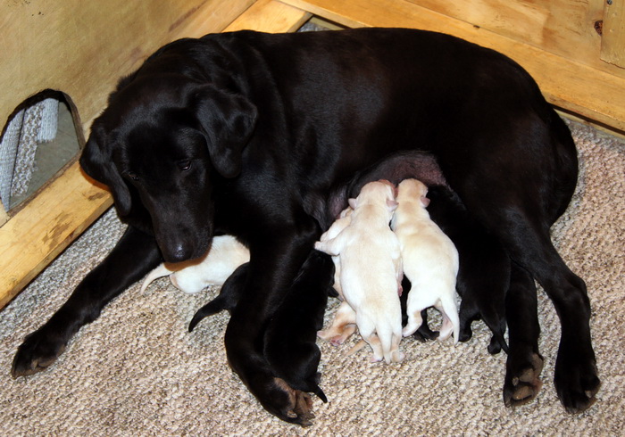 Dam- Stoneridge Anne Raisa Ruckus JH OFA Excellent (1994 NFC FC Candlewood's Raisa Ruckus, Hips OFA Excellent, Eyes Cerf (FC AFC Wilderness Harley To Go/Candlewood's Calamity Kate) and Wingmaster's Fishtrap, OFA Excellent, Eyes Cerf (FC AFC '89 CNAFC CFC Aces High III /FC AFC Fishtrap Aggie).