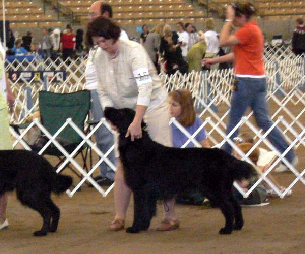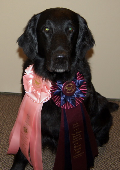 Teddy's 1st trip to a Flat-Coated Retriever Specialty was to the 2012 Nationals. Teddy has not been shown in conformation in over 7 years so we thought that we should at least let him do it once! We entered him in the Field Trial Class which was a large class of 15. Teddy made the first cut....we were thrilled....he made the cut to the final 4 and we were thrilled that he would come home with a ribbon. Then he won the class!!! GO TEDDY!!! Teddy was shown by Judy Gladson and she did an excellent job with him!